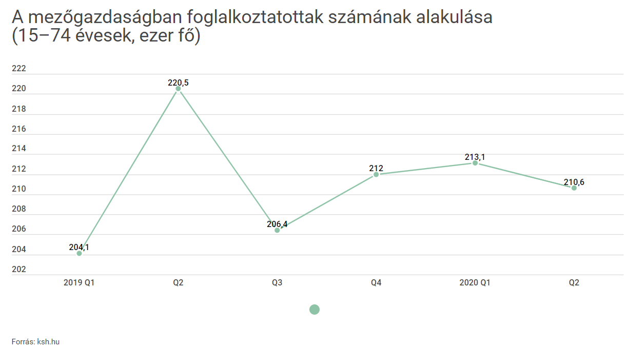 Az április-júniusi időszakban átlagosan 210,6 ezren dolgoztak a mezőgazdaságban Magyarországon, ez 2,5 ezerrel kevesebb, mint a január-márciusi időszak adata – derült ki a Központi Statisztikai Hivatal (KSH) "Foglalkoztatottság" című gyorstájékoztatójából. A mérséklődés ellenére stabilabbnak bizonyultak a koronavírus fellángolásának negyedévében a mezőgazdasági munkahelyek az iparban és szolgáltatási szektorban találhatókhoz képest.