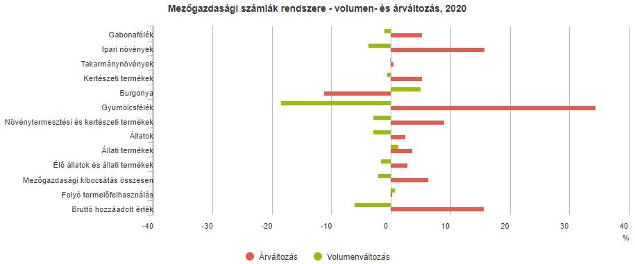 A növénytermesztés termelési volumene 2,9 százalékkal mérséklődött az első, előzetes adatok szerint 2020-ban az előző évhez képest. A gabonafélék mennyisége összességében 1,1 százalékkal kisebb lett, a búza 7,0 százalékos csökkenését csak az árpa (3,6 százalék) és a kukorica (3,2 százalék) termelésének növekedése ellensúlyozta. A tavasz aszályos időjárása a repce fejlődését viselte meg a leginkább, termésmennyisége 14 százalékkal visszaesett, a napraforgóé nőtt, a fehérjenövényeké szintén csökkent, így az ipari növények mennyisége összességében 3,7 százalékkal zsugorodott. A takarmánynövények és az egyéb növényi termékek mennyisége nem változott, a kertészeti termékeké 0,6 százalékkal kisebb lett.