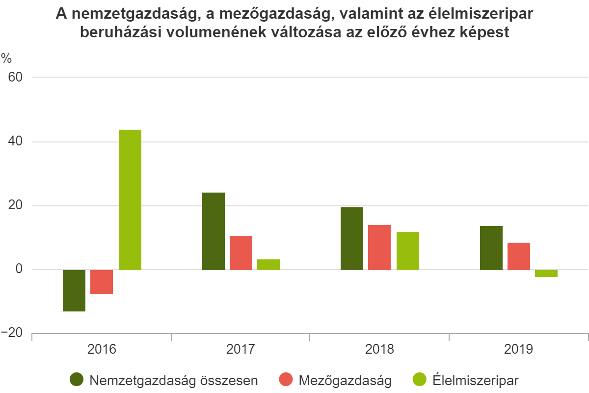 A nemzetgazdaság beruházási volumene 14, a mezőgazdaságé 8,5 százalékkal nőtt, az élelmiszeriparé ezzel szemben 2,1 százalékkal csökkent – derült ki a „Helyzetkép a mezőgazdaságról, 2019” című jelentésből, amelyet a Központi Statisztikai Hivatal (KSH) készített.