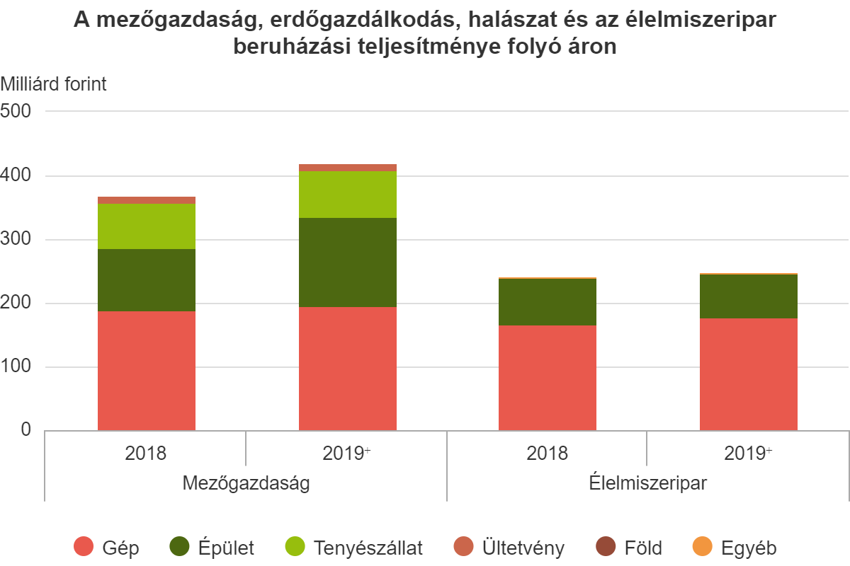 A tavalyi esztendőben az előzetes adatok szerint a nemzetgazdaság összes beruházási értéke 10 556 milliárd forint volt, ebből a mezőgazdaság, erdőgazdálkodás, halászat 420 milliárd forinttal (4,0 százalék), az élelmiszeripar 248 milliárd forinttal (2,3 százalék) részesedett.