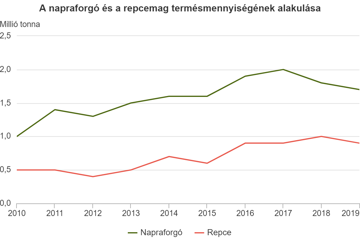 Az olajos magvúak közül a napraforgó és a repce betakarított területe is csökkent tavaly, az előbbié 8,1, az utóbbié 8,8 százalékkal. A napraforgó mennyisége (1,7 millió tonna) 7,0 százalékkal kevesebb volt. A repce termése 11 százalékkal csökkent, 900 ezer tonnát takarítottak be.