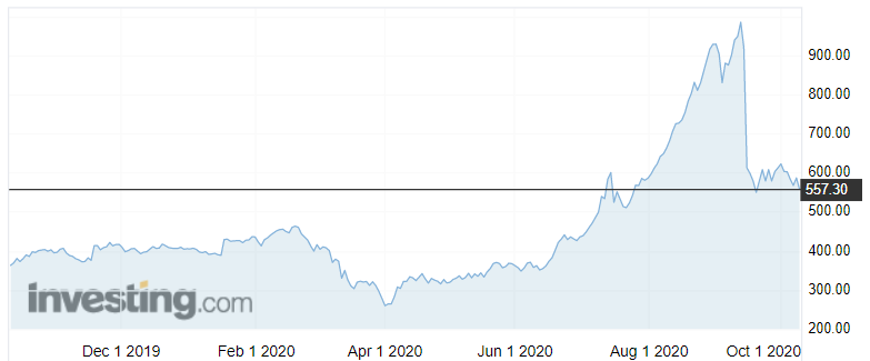 A fűrészáru (lumber) árának alakulása az elmúlt egy évben (dollár/1000 darab egy láb hosszúságú, egy láb széles és egy hüvelyk vastagságú fűrészáru). Forrás: investing.com