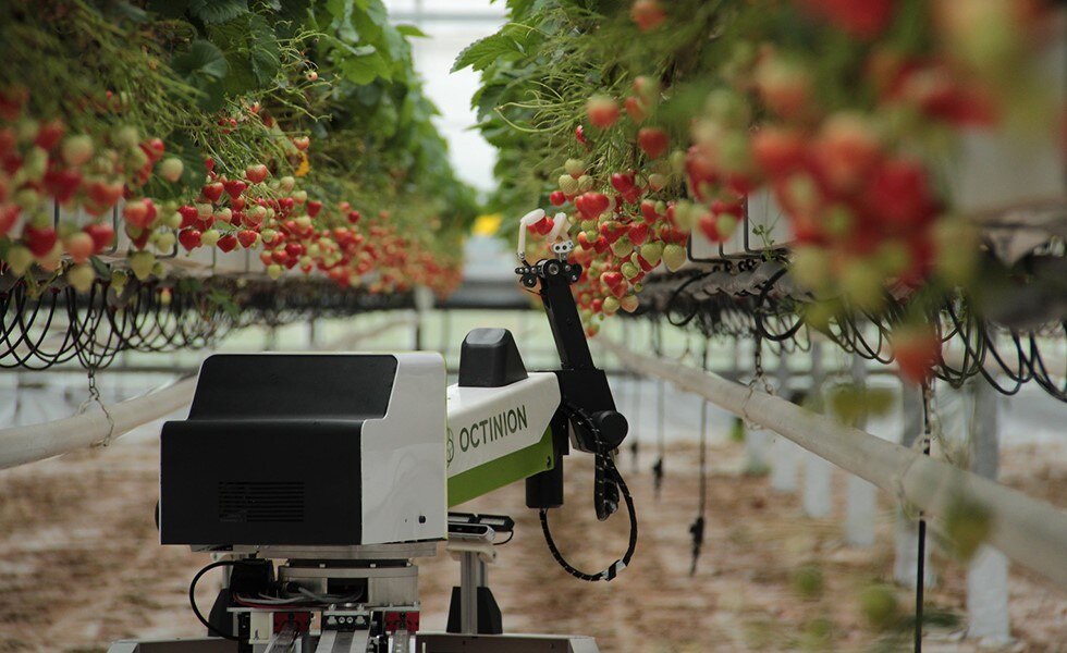 A brit Octinion cég fejlesztette ki a szamócaszedő robotot, amelynek számtalan előnye mellett csak egy hátránya van: szabadföldi betakarításra alkalmatlan. Viszont, ha termesztő tálcákról függő szamócaszemekről van szó, a Rubion nevű robot egymaga több gyümölcsöt szed le, mint két-három gyakorlott munkás.