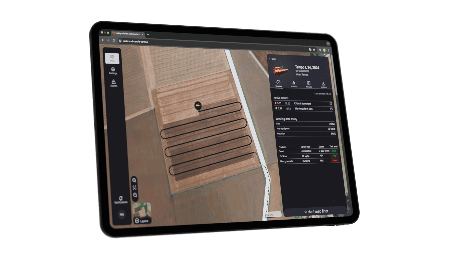 „A Väderstad E-Connect a gyártó telematikai megoldása, amely valós idejű flottamegfigyelésre mezőgazdasági munkák nyomon követésére, valamint a munkagépek működési paramétereinek ellenőrzésére szolgál. Az E-Connect a gépi adatokat döntésekké alakítja, segítve a gazdákat a teljesítmény optimalizálásában, az állásidő csökkentésében és a munkavégzés hatékonyságának maximalizálásában” – mondja David Askenteg, a Väderstad intelligens gépekért felelős igazgatója, majd hozzáteszi: