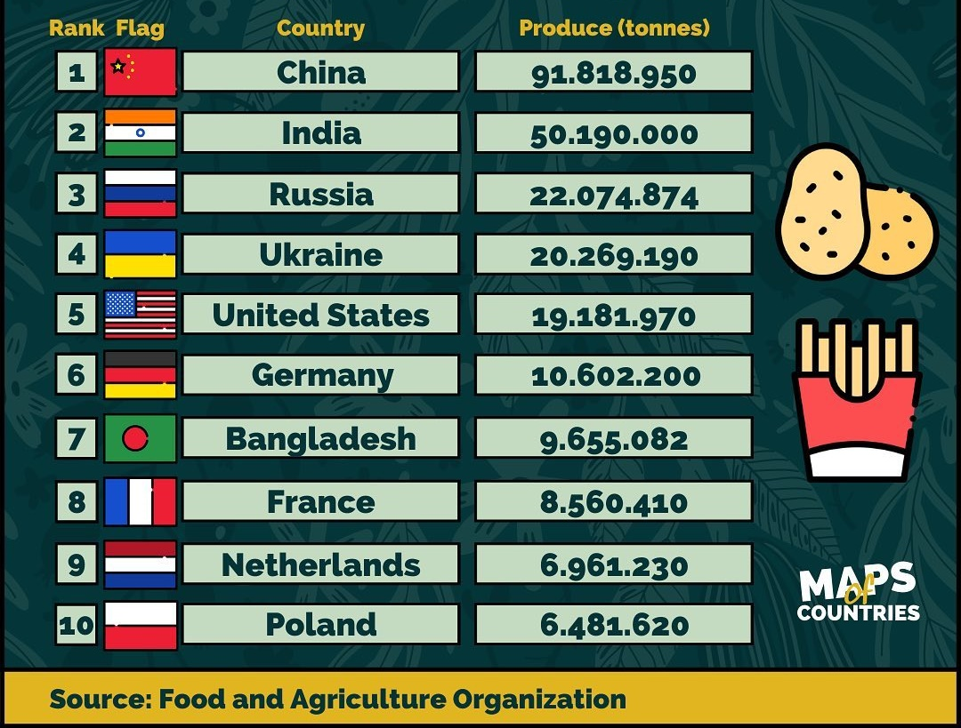Éves 91,82 millió tonnás terméssel világelső Kína a burgonyatermesztésben. India 50,19 millió tonnás eredménnyel követi a legnépesebb országot a listán. Oroszország 22,07 millió tonnás betakarított burgonyamennyiséggel áll a harmadik helyen – derült ki az Egyesült Nemzetek Szervezetének Élelmezésügyi és Mezőgazdasági Szervezete, a FAO 2019-es évre vonatkozó adataiból, amelyek alapján a Maps of Countries Instagram-oldal készített infografikát. A negyedik helyen szintén kelet-európai ország, Ukrajna következik 20,27 millió tonnával. Az Egyesült Államok áll az ötödik helyen, ott 19,18 millió tonnás termést regisztráltak.