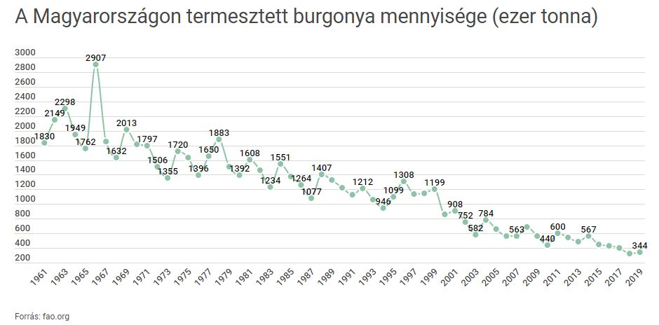 Magyarországon a FAO adatai szerint 2019-ben 344 ezer tonna burgonyát termesztettek. Ez a mennyiség igaz, hogy 16 tonnával magasabb a 2018-as 328 ezer tonnánál, de így is beleillik a hatvanas évek óta folyamatosan csökkenő trendbe. A 2018-as adat egyébként az 1961 óta rendelkezésre álló adatsor mélypontját is jelenti egyben. Az 1966-os 2,91 millió tonnás termés számít ebben az időszakban rekordnak, utána két év alatt 1,63 millió tonnára csökkent a magyarországi termés, ami 1969-re 2,01 millió tonnára növekedett, de utána néhány éves időszaki emelkedésekkel folyamatos a csökkenés.
