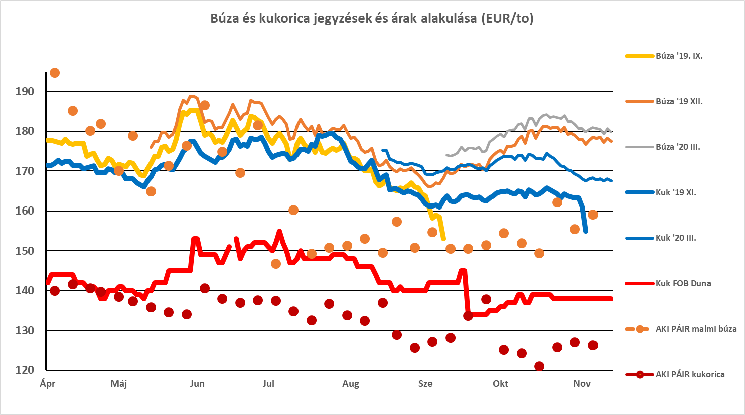A kukorica piacán még mindig fontos a betakarítás előrehaladásának alakulása. Az utóbbi napokban az USA-ban a hirtelen nagy hideg, Európában a csapadékos idő hátráltatta a betakarítást. Ukrajnában ez nem így volt, ott kedvező maradt az idő és a legutóbbi jelentések a vártnál is jobb termést jeleznek. Itt megintcsak véleményeltérés van az USDA és a magántermésbecslő cégek között – az utóbbiak pesszimistábbak és 34 millió tonnás termést várnak csak, szemben az USDA 35,5 millió tonnás előrejelzésével. A számok alakulása itt azt is eredményezheti, hogy az export volumene 30 millió tonna alá csökken és így a 2018/19-es szezonban exportált mennyiségnél kisebb lehet. Ez csökkentheti a kínálati nyomást és ez tovább segítheti az árak tartott jellegét, de nem eredményez áremelkedést, mert még mindig drámaian nagy mennyiséget jelent!