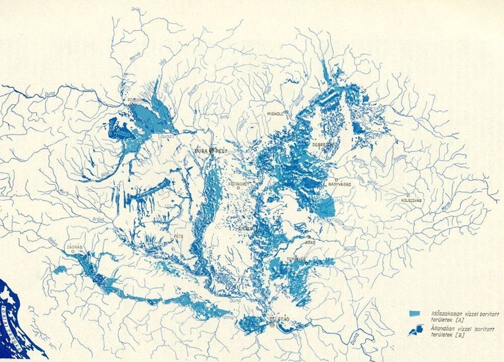 1. ábra: A Kárpát-medence vízborította területei a XVIII. század végén, a magyar vízszabályozási munkák megindítása és tervszerű végrehajtása előtt (Ihrig, 1973)