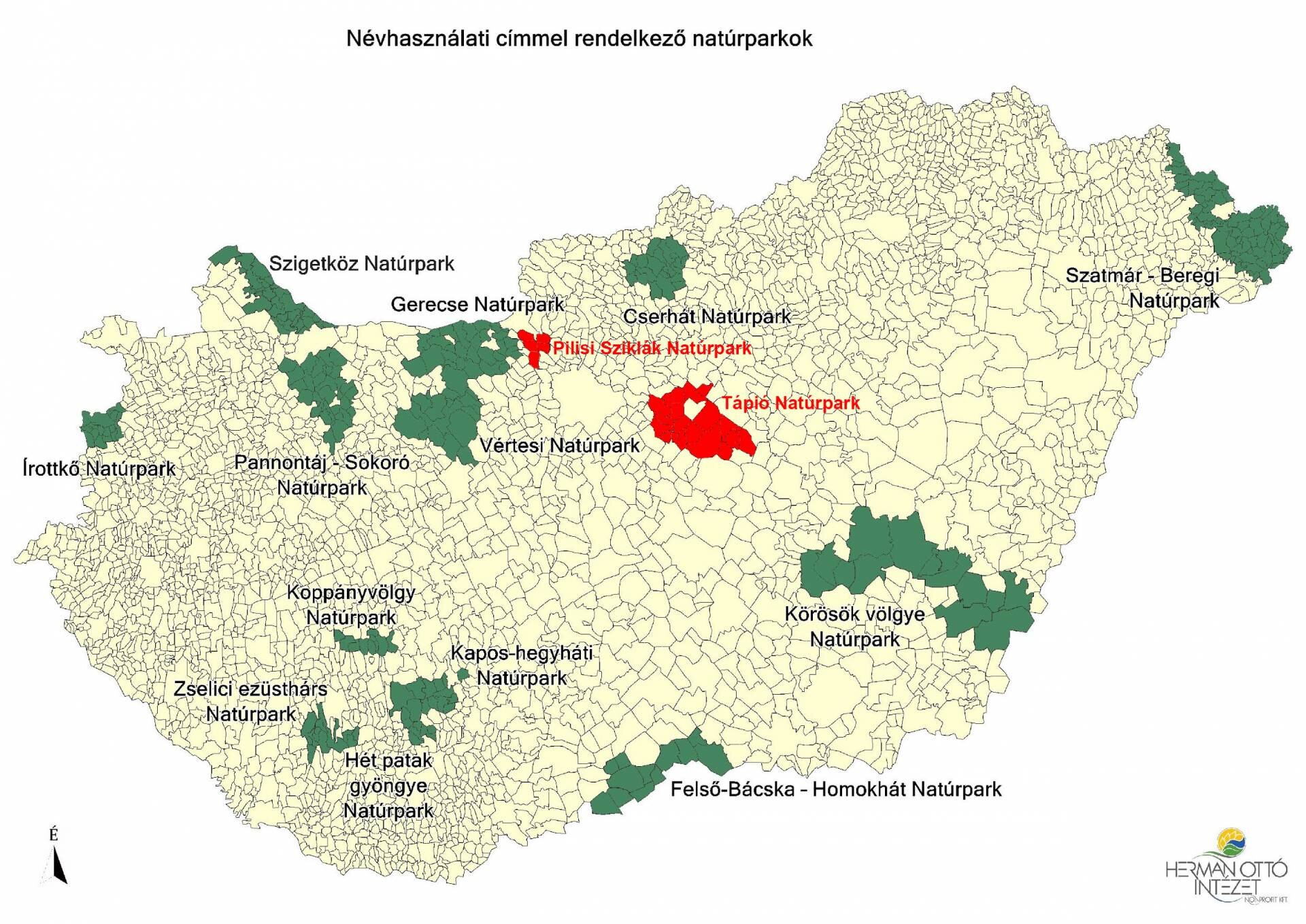 2. ábra: Névhasználati címmel rendelkező natúrparkok az országban a két legújabb taggal (Tápió Natúrpark, Pilisi Sziklák Natúrpark) (Forrás: Táji örökségen alapuló vidékfejlesztés a Pilisi Natúrpark területén)
