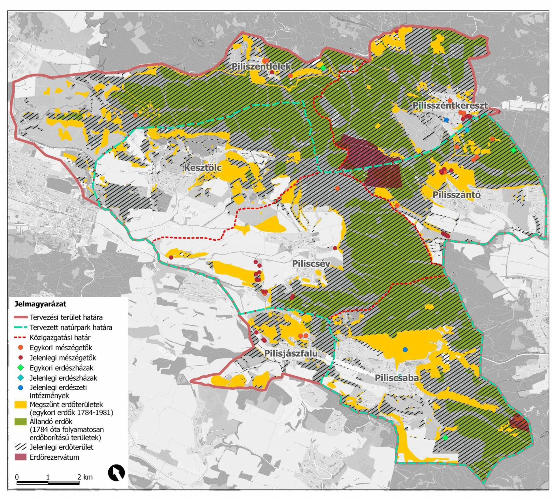 3. ábra: Erdőterületek változásai, stabil és megszűnt erdőterületek, erdészethez köthető tájelemek a pilisi térségben (Forrás: Táji örökségen alapuló vidékfejlesztés a Pilisi Natúrpark területén)