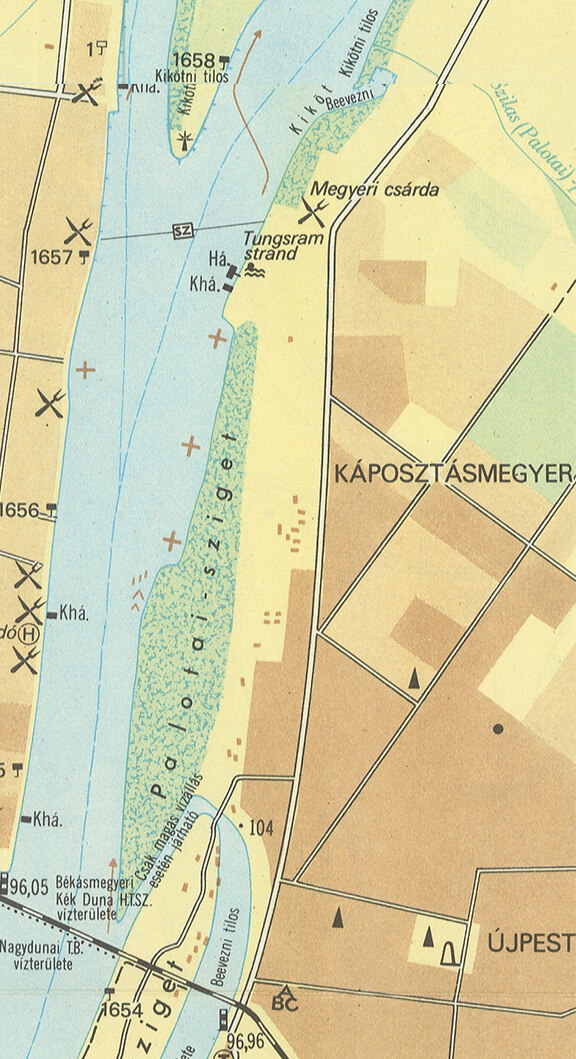 A Tungsram strand (6. ábra) 1938-ban nyitotta meg a kapuit, habár az 1958-as térképen még nem látható. Ekkor még csak egy homokos szabadstrand szakasz volt a Megyeri Csárda mellett.