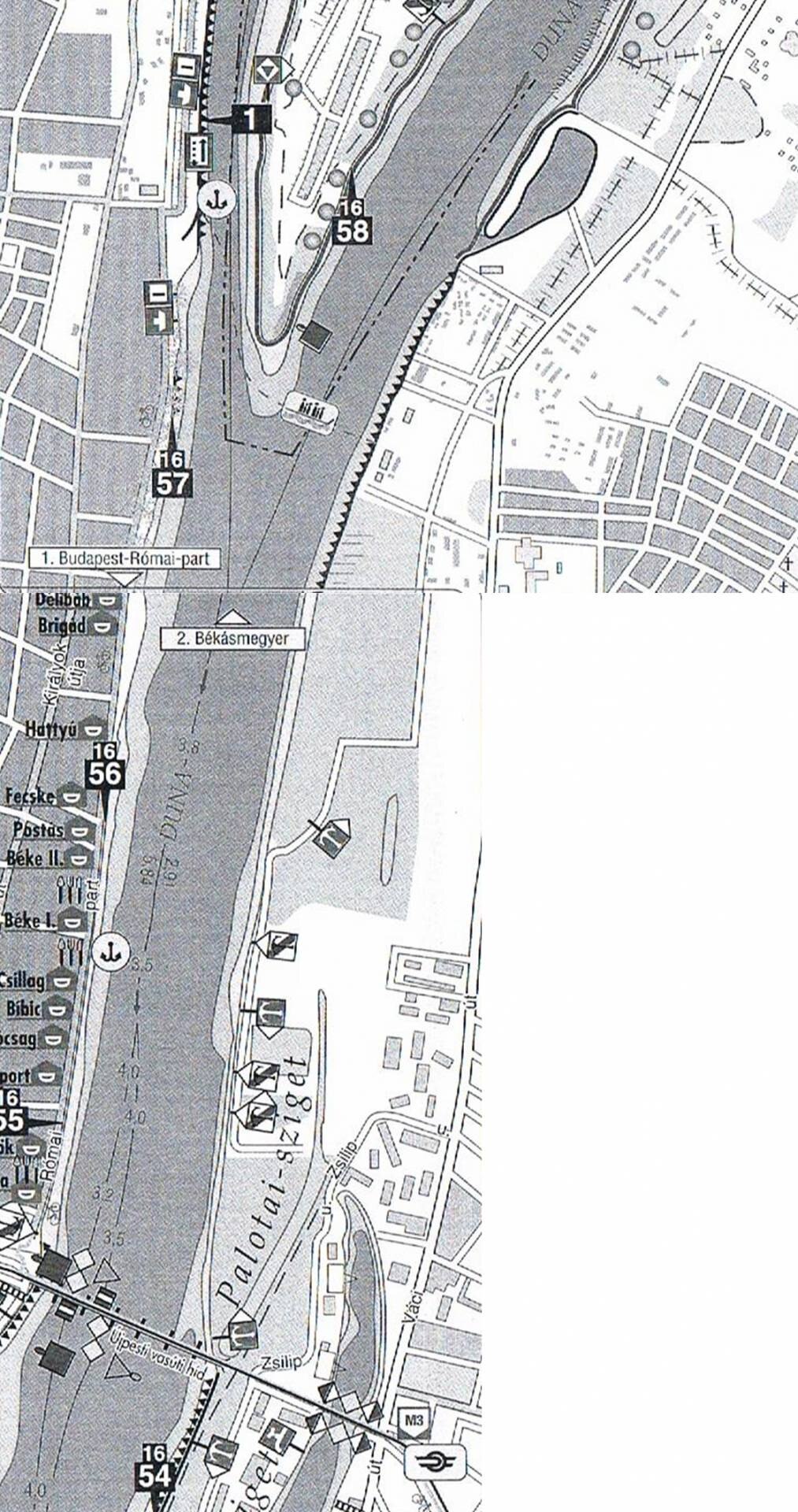 Az utolsó térkép 1997-ben készült (7. ábra), és szintén feltüntet minden fontos információt, azonban egy sokkal közérthetőbb és modernebb formában. Újpesten az Újpesti-kikötő (Téli-kikötő) felett jelöl hajóállomást a térkép, ez gyakorlatilag megegyezik a mai helyével az akkorinak.