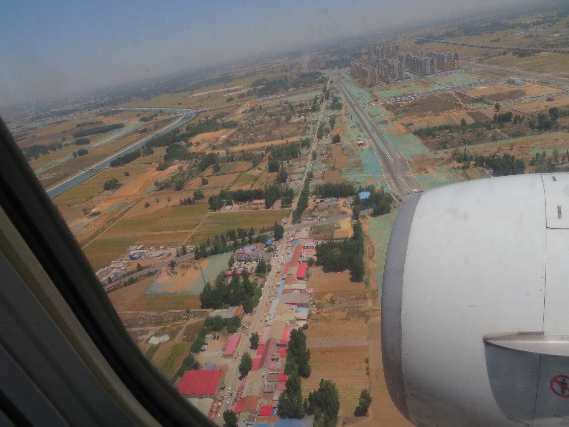 2. ábra: Közeledünk Zhengzhou-hoz, a repülő ablakából kirajzolódik egy hatalmas lakótelep, mellette látható már a lakótelep építés következő üteme, és az épülő autópálya menti lefedett terület továbbá a kistáblás mezőgazdasági művelés