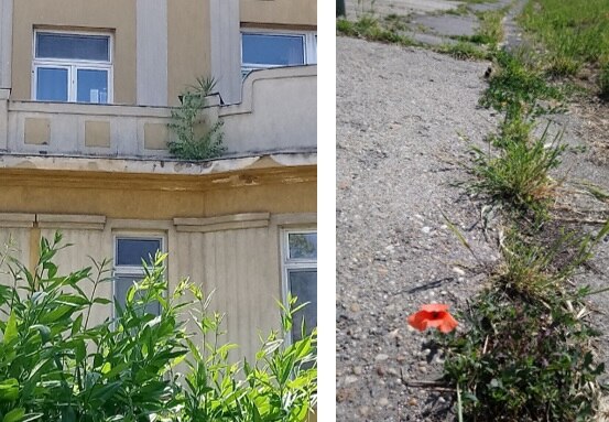 3. ábra: Épület falára telepedett nyír (Betula pendula) és járdaközi repedésekben felnövő gyomnövényzet (köztük pipaccsal – Papaver rhoeas) (Fotó: Varga Dalma, 2019.)