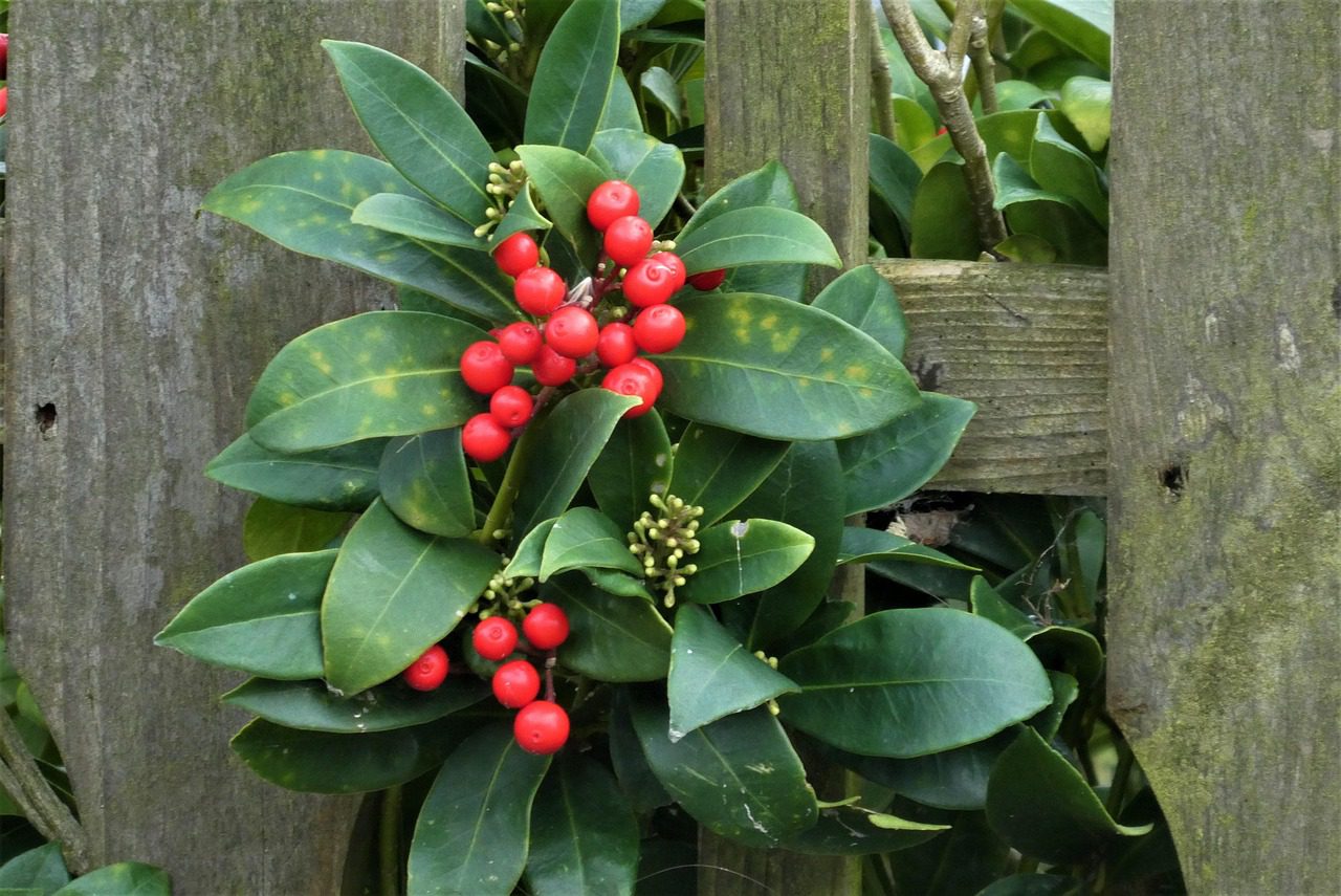 A japán dérbabér (Skimmia japonica) savanyú talajban fejlődik szépen, örökzöld levelei és élénkpiros bogyói különleges látványt nyújtanak a hideg hónapokban is. A konténeres tartást jól bírja, és védett helyen a mínuszokat is átvészeli.