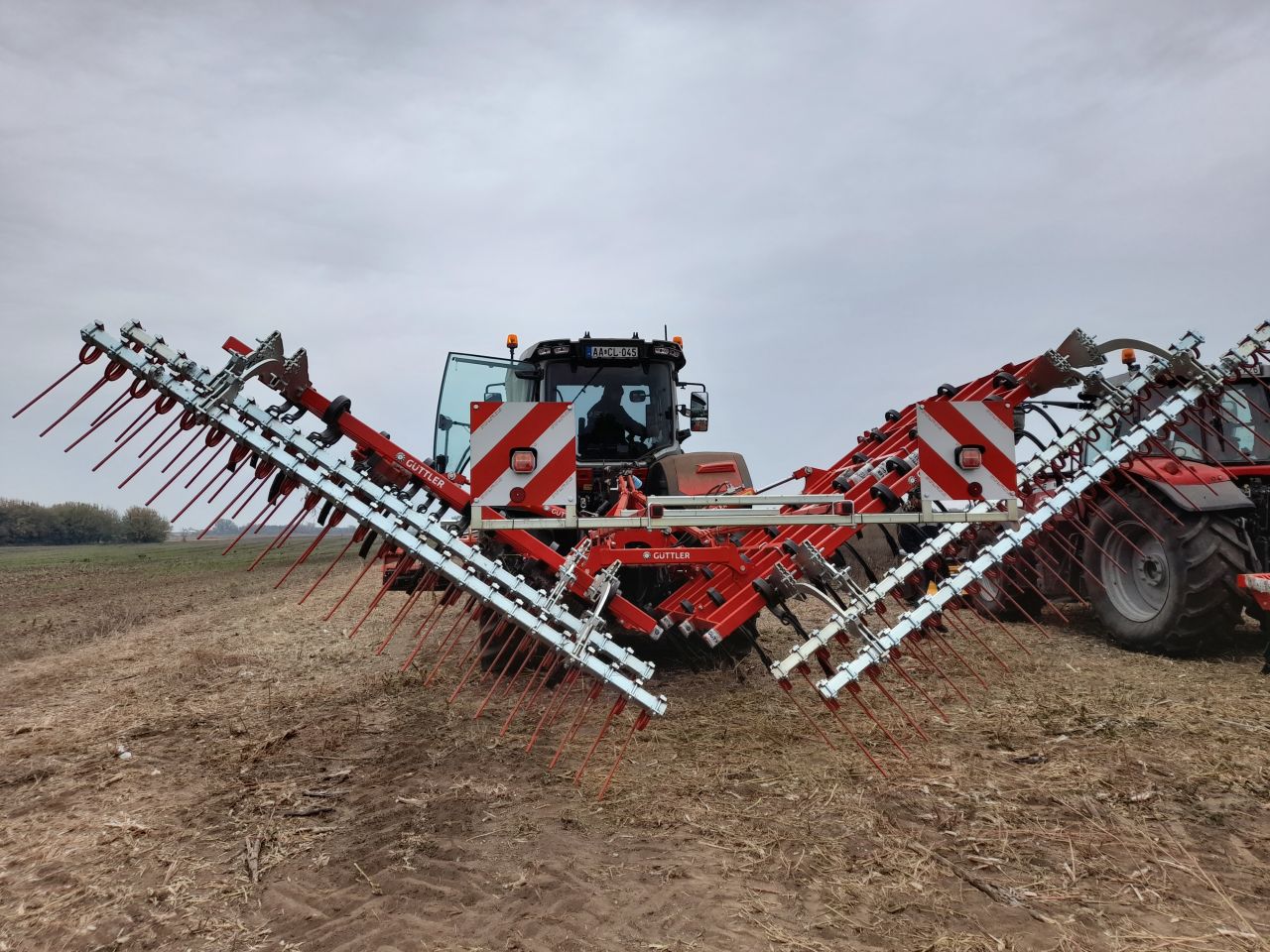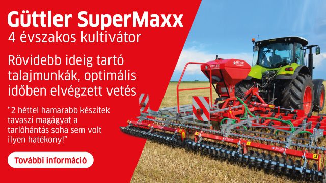 A hajdúnánási bemutatón a Güttler SuperMaxx kultivátor is megmutatta képességeit a szántóföldön. A gyártó által négyévszakosnak nevezett munkagép 3–12 méter közötti munkaszélességben érhető el (9 métertől fölfele már nem függesztett, hanem vontatott kivitelben), és az akár 15 cm-es sekély tarlóhántás mellett talajszellőztetéshez, köztes növények vetéséhez és fagyos talajok műveléséhez egyaránt ajánlják.