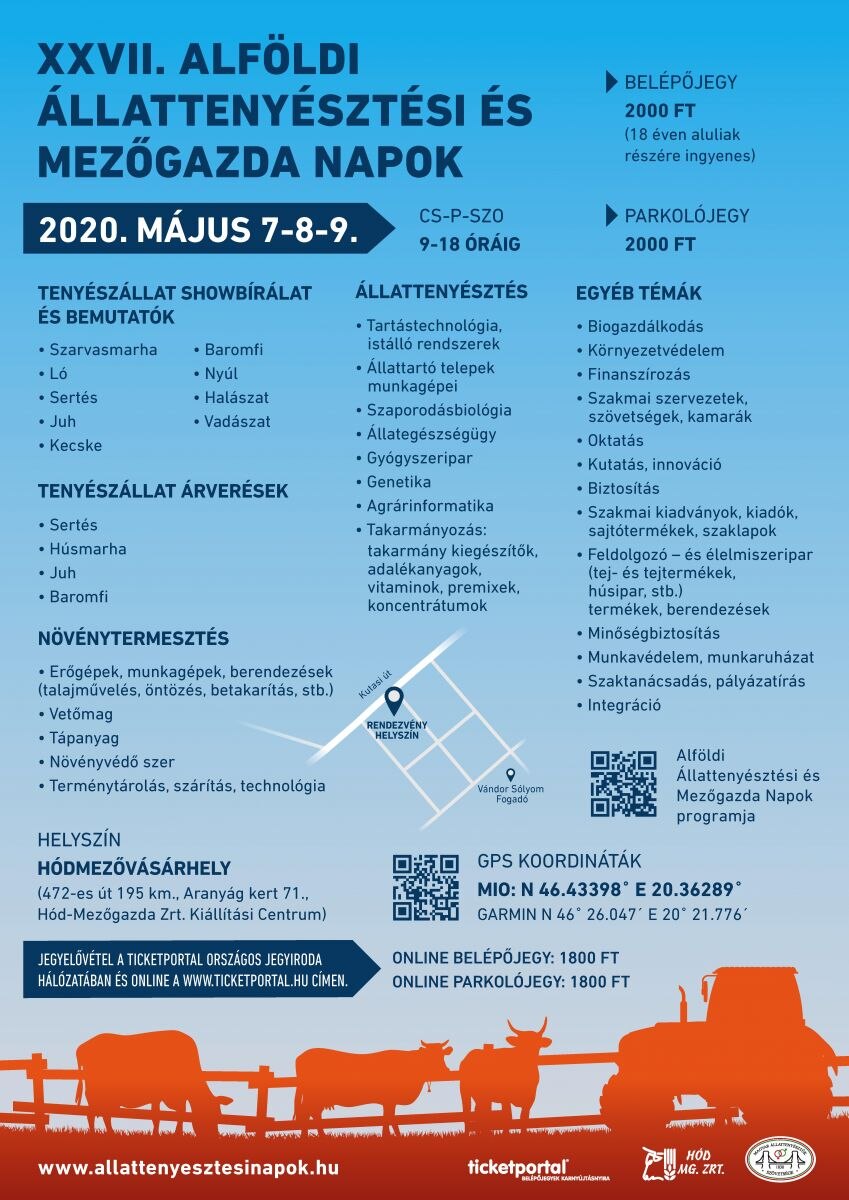 Sajnálattal tájékoztatjuk Önöket, hogy figyelembe véve a kormány eddigi döntéseit és a WHO világjárvány deklarációját, a Covid-19 pandémiára tekintettel ELMARAD a  május 7-8-9-re tervezett XXVII. Alföldi Állattenyésztési és Mezőgazda Napok.