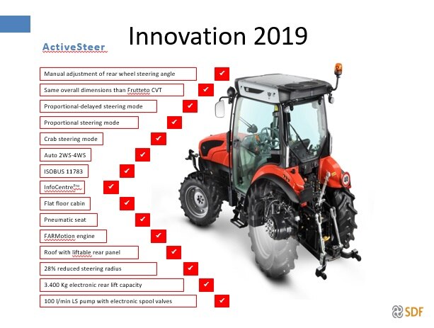 A kiállításon a SAME bemutatta speciális traktorainak legerősebb változatát a Frutteto CVT 100 ActiveSteer típust, amely a kategória első négykerék kormányzású változata. Ez a high-tech megoldás nagymértékben növeli a manőverező képességet azáltal, hogy akár 28%-kal képes csökkenteni a traktor fordulási-átmérőjét. Lejtős területen különösen előnyös, mivel a hátsó kerekek szögének változtatásával a vezető ellentarthat a lefelé ható erőnek.