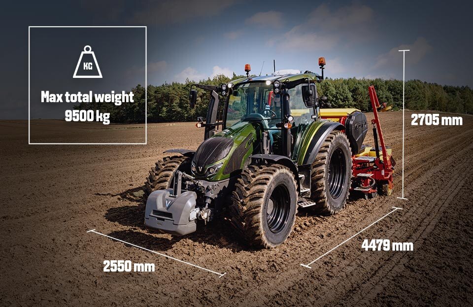 A traktorok geometriai mérete: 2,80 m magasság, 2,55 m szélesség és 4,40 m hosszúság (homlok függesztőberendezés nélkül). Az 5,14 t tömegű (max. össztömeg 9,5 t) traktorok tengelytávja 2,55 m, legkisebb fordulási sugara 4,36 m.