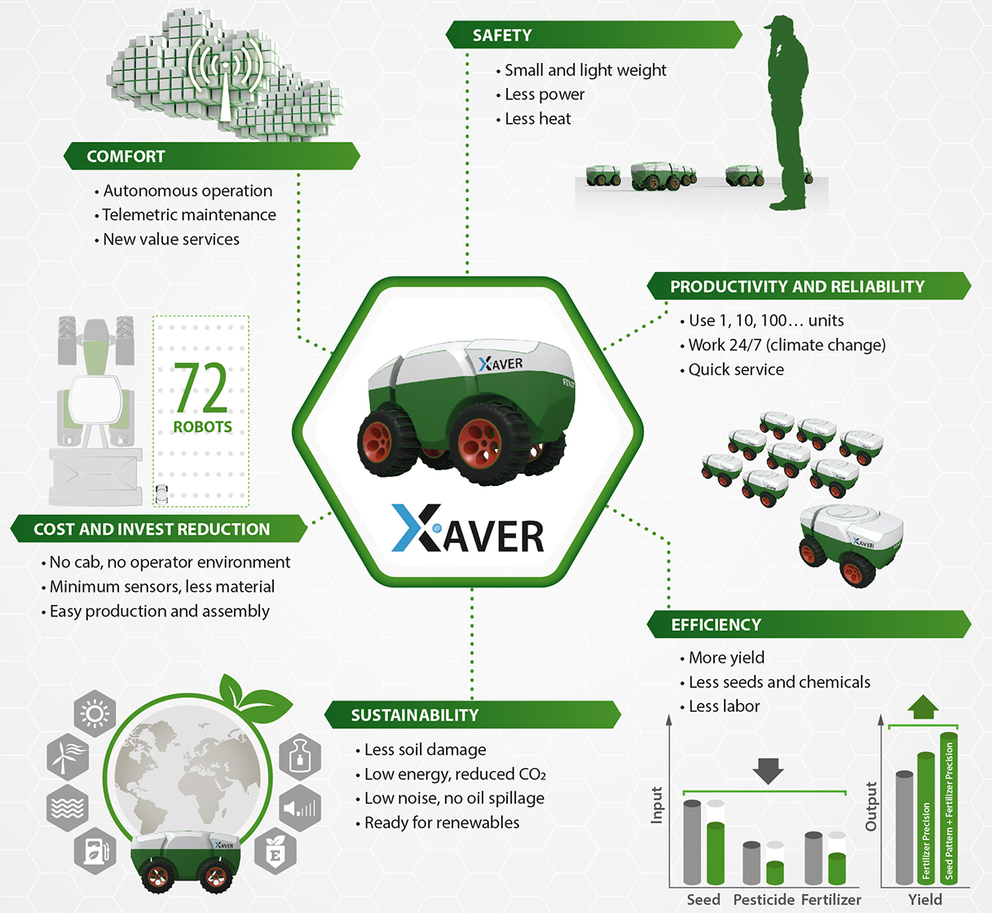 A Xaver robotok egy átlagos traktorhoz képest 95%-kal kevesebb hőt fejlesztenek, 95%-kal kisebb zajt keltenek, 80%-kal csökkentik a talajtömörítés mértékét és 70% energiát takarítanak meg. További előnyként jelentkezik, hogy alkalmazásukkal 50%-kal csökkenthető a növényvédő szer és 5%-kal a vetőmag felhasználás. A robot tömege nem több, mint 40 kg, ezért vonóerő kifejtésre nem alkalmas, vagyis a talajműveléshez továbbra is traktort kell alkalmazni.