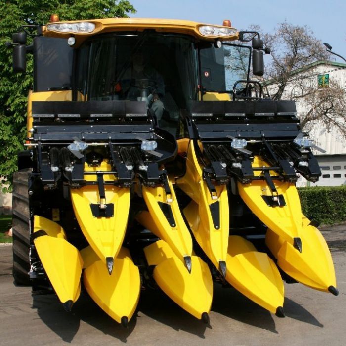 - Opcionális kiegészítők: csonktaposó a gumiabroncsok védelméért; talajkövető az automata magasságállítás és az optimális tarlómagasság beállítása érdekében; oldalmagasítás a cső- és szemveszteség minimalizálásáért; forgó sorválasztó a nedves, dőlt állományú kukoricaszárak hatékony betereléséért; csőmentő gumilemez a kukoricacső előrebukásának meggátolása érdekében; napraforgó betét.