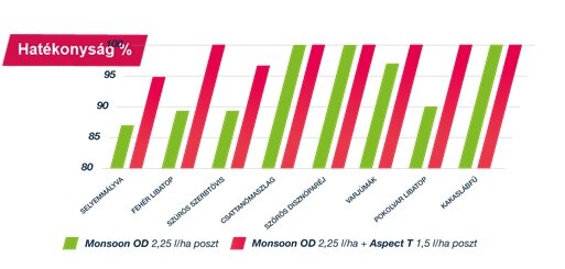 Monsoon OD a magyar kukorica herbicidek között az egyik legszelektívebb, elsősorban egyszikűek ellen alkalmazható készítmény (magról kelő és évelő egyaránt), mely széles kétszikű spektrummal rendelkezik. Az első, széfener technológiával megerősített hatékony ALS-gátló herbicid a kukoricában. A hatástartam növelése érdekében talajhatással is rendelkező kombinációs partner alkalmazása ajánlott. 17 év felhasználási tapasztalata azt mutatja, hogy a kukorica gyomosodásában időközben bekövetkezett változások, egy megfelelő kombinációs partner alkalmazását teszik szükségessé. Az Aspect T kiegészíti a Monsoon OD spektrumát a szívós keserűfű-fajok (főleg szuláklevelű keserűfű, madárkeserűfű, lapulevelű keserűfű, baracklevelű keserűfű) ellen, javítja a hatékonyságot olyan mélyről kelő gyomnövények ellen, mint a selyemmályva, szerbtövis-fajok, vagy a libatop-fajok. A kombináció ugyancsak hozzájárul a magról későn kelő egyszikűek elleni hatáshoz is, például muharfajok, ujjasmuhar-fajok, valamint fenyércirok. Évelő egyszikűekkel erősen fertőzött területen (fenyércirok, tarackbúza) 2,5+1,5 l/ha a javasolt dózis.