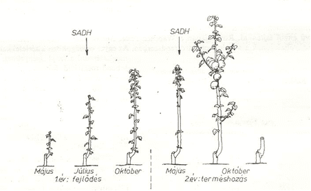 Az erőteljesen növekvő nemes hajtást júliusban borostyánkősav-dimetilhidrazid (SADH) nevű vegyszerrel lepermetezték. Ez a szer a gibberellinsav szintézisének gátlása révén úgy változtatta meg a növények hormonháztartását, hogy a hajtások hosszanti növekedését csökkentette, és az oldalukon a virágrügyek kialakulását serkentette. Enélkül a szer nélkül az alma hajtások csak a végükön képeztek volna virágrügyet, az oldalukon csak elvétve.