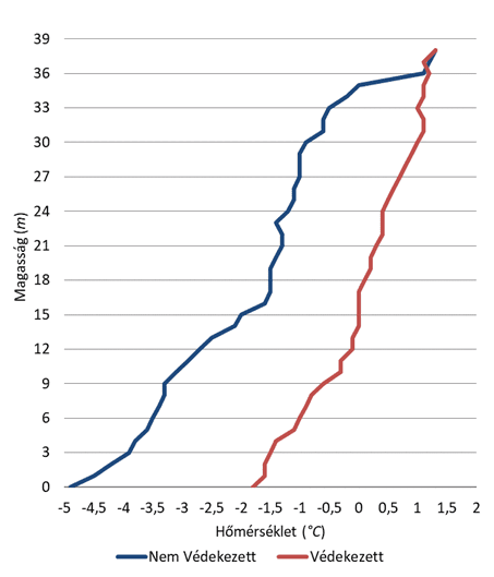 A 2025. április 7-i éjszaka során a talaj közelében mért 2–2,5 m/s átlagos szélsebesség miatt nem alakult ki hőmérsékleti inverzió. A szél átkeverő hatása miatt a vertikális profil gyakorlatilag homogén hőmérsékleteloszlást mutatott, amiben néhány tized fokos eltérést csak az ültetvény tömege miatti szélprofil-különbség okozott. A szélgépeket teszt jelleggel elindítottuk ugyan, de a várakozásainkkal összhangban sem a kontroll, sem a védett területen nem tapasztaltunk érdemi hőmérséklet-különbséget (2. ábra).