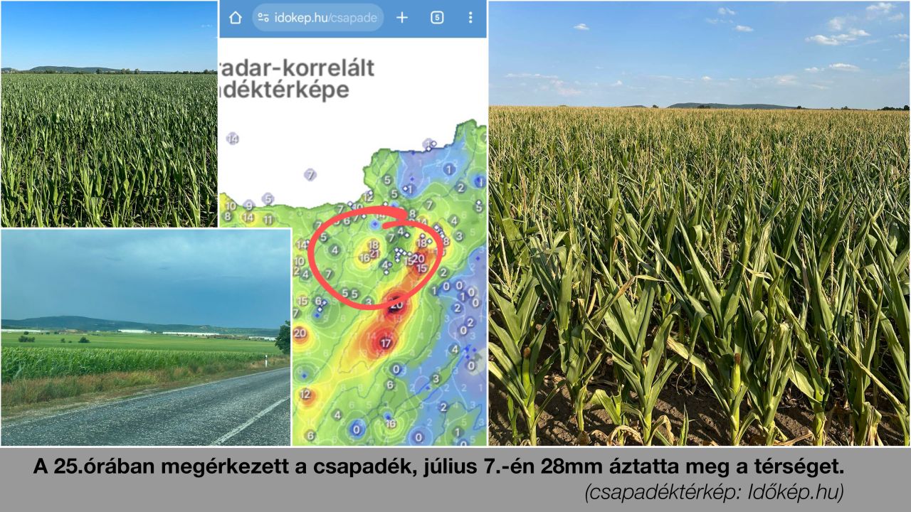 A 25. órában megérkezett a csapadék, július 7-én 28 mm áztatta meg a térséget, a KWS OLTENIO ekkor már virágzott, a későbbi virágzású KWS HYPOLITO még éppen a címerbontás elején tartott.