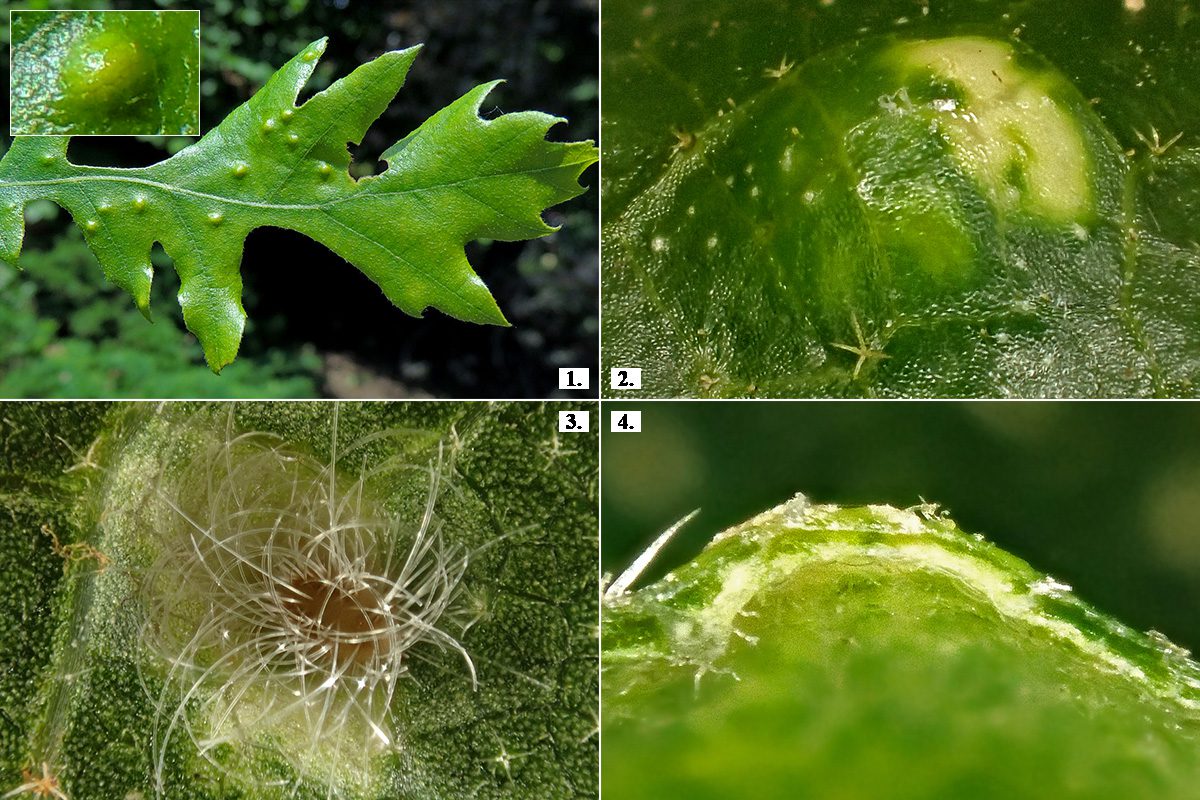 A 3/1 belső képen: egy fiatal (keretezett rész) és egy idős gubacs (befoglaló kép) látható a levél felső oldalán. A gubacsképződés kezdetén, az alig kiemelkedő domború részt kb. 1 cm átmérőjű halvány zöldessárga szegély övezi, miközben a központi domborulat megőrzi a levél eredeti színét. Ebben a stádiumban a gubacs nehezen észlelhető. Amikor a lárva elhagyta a gubacsot, a világoszöld rész pergamenszerűen elszárad és feltűnő, lila erezetű és szegélyű sárgásbarna folttá alakul. Saját megfigyeléseink szerint május végén már nem találhatók lakott gubacsok. Egyes leírások szerint ezek a száraz foltok később kiesnek a levélből.