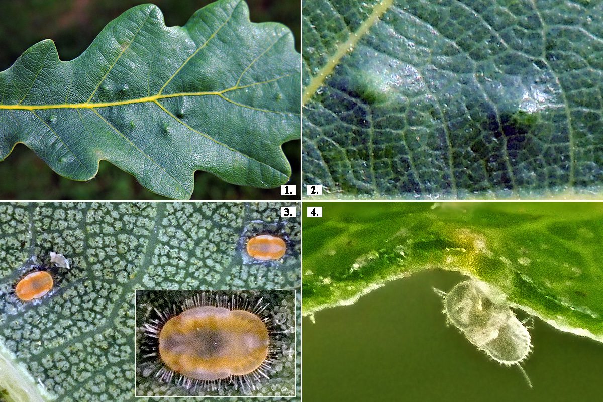 Az alábbi gyűjtőkép felvételeit Budapest XI. kerületében a Bikás parkban élő, erősen fertőzött, törzskárosodott, leromlott, körülbelül 15 éves kocsányos tölgy (Quercus robur) gallyairól, különböző időpontokban készítettük. A fa állapotát jellemzi, hogy embermagasságig szinte minden vesszője és gallya fertőzött volt. A fényképezett tüneteket a tölgy-himlőspajzstetű (Asterodiaspis variolosa) fajnak tulajdonítjuk, de mikroszkópos vizsgálatok hiányában a fenti identitás ideiglenesnek tekintendő!