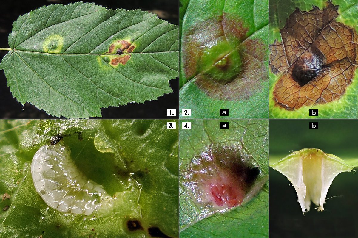 A 4/1 belső képen: elhagyott gubacsokat hordozó tatár juhar levelének felső oldalát mutatjuk. Az egykamrás, gubacsok csoportosan helyezkednek el a levelek középerén illetve mellékerein. A levelenkénti gubacsszám legtöbbször 1-3 között változott, de fényképeztünk olyan levelet is, amelyiken 15 gubacs volt. A mintegy száz gubacs helyszíni vizsgálata (2017. 07. 12.) során mindössze három lakott gubacsot találtunk. Az ott élő lárvanépesség befejezte fejlődését és a talajba vonult bábozódni. Fiatal gubacsok jelenlétét nem észleltük. A nemrég elhagyott gubacsokat még sárgászöld gyűrű szegélyezte, és a központi domborulat is megőrizte a levél eredeti színét. A korábban elhagyott gubacsok szegélyén barnuló nekrotikus foltok alakultak ki. A talajba húzódás kezdetén elhagyott gubacsok már teljesen elszáradtak (4/2b) kép.