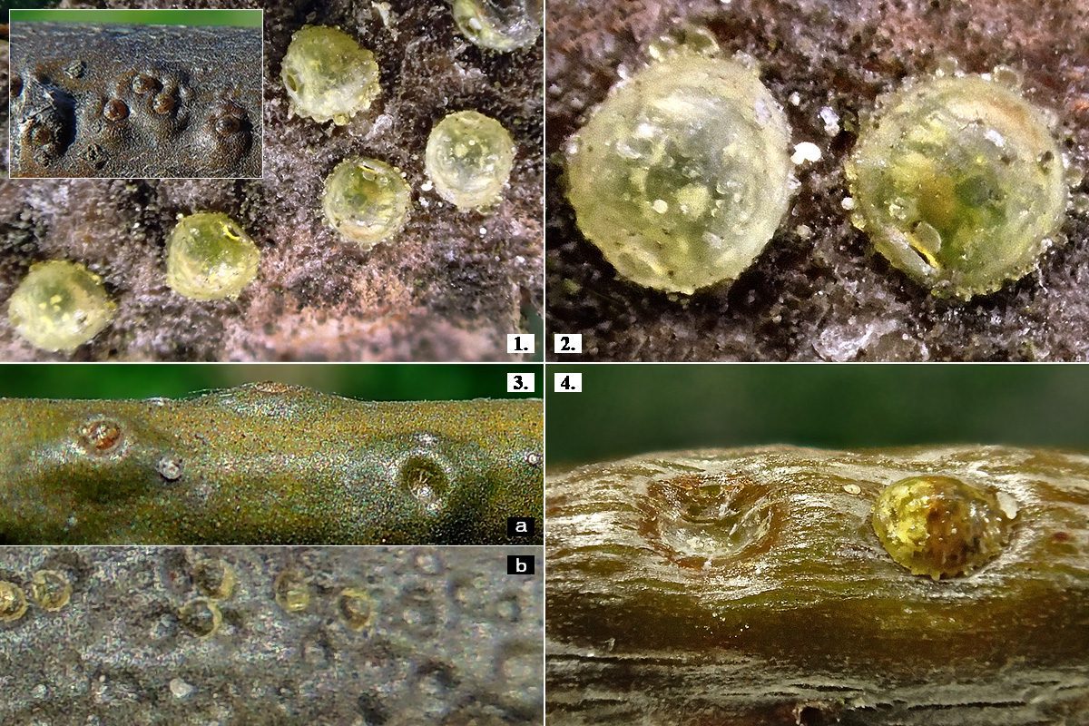 6. kép: A tölgy-himlőspajzstetű (Asterodiaspis variolosa) mélyedéses gubacsai a kocsányos tölgy (Quercus robur) fiatal ágain
