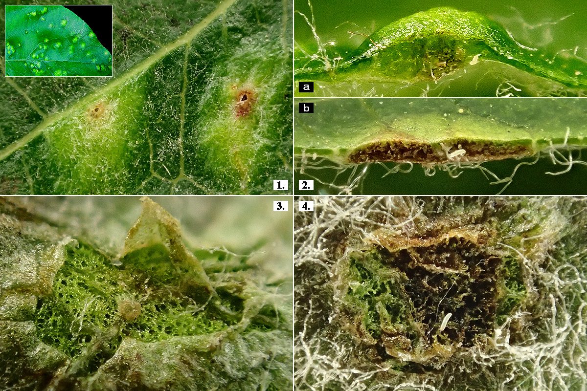 A 3/3 belső képen: egy gubacsos levélfonák részletén a gubacs közeli erezet rendellenes duzzadásait és szokatlan mintázatát, vonalvezetését mutatjuk. A leveleken gubacsok parányi nyílása (egy gubacson egy nyílás) jellemzően a fonáki oldalon a gubacs központi részénél található, ahol apró nekrotikus folt alakul ki. A levélgerincen illetve a termés zöld burkán fejlődött gubacsok nyílásai azok felszínén találhatók. A levelek gubacsainál felső oldali nyílásokat csak néhány esetben észleltünk.