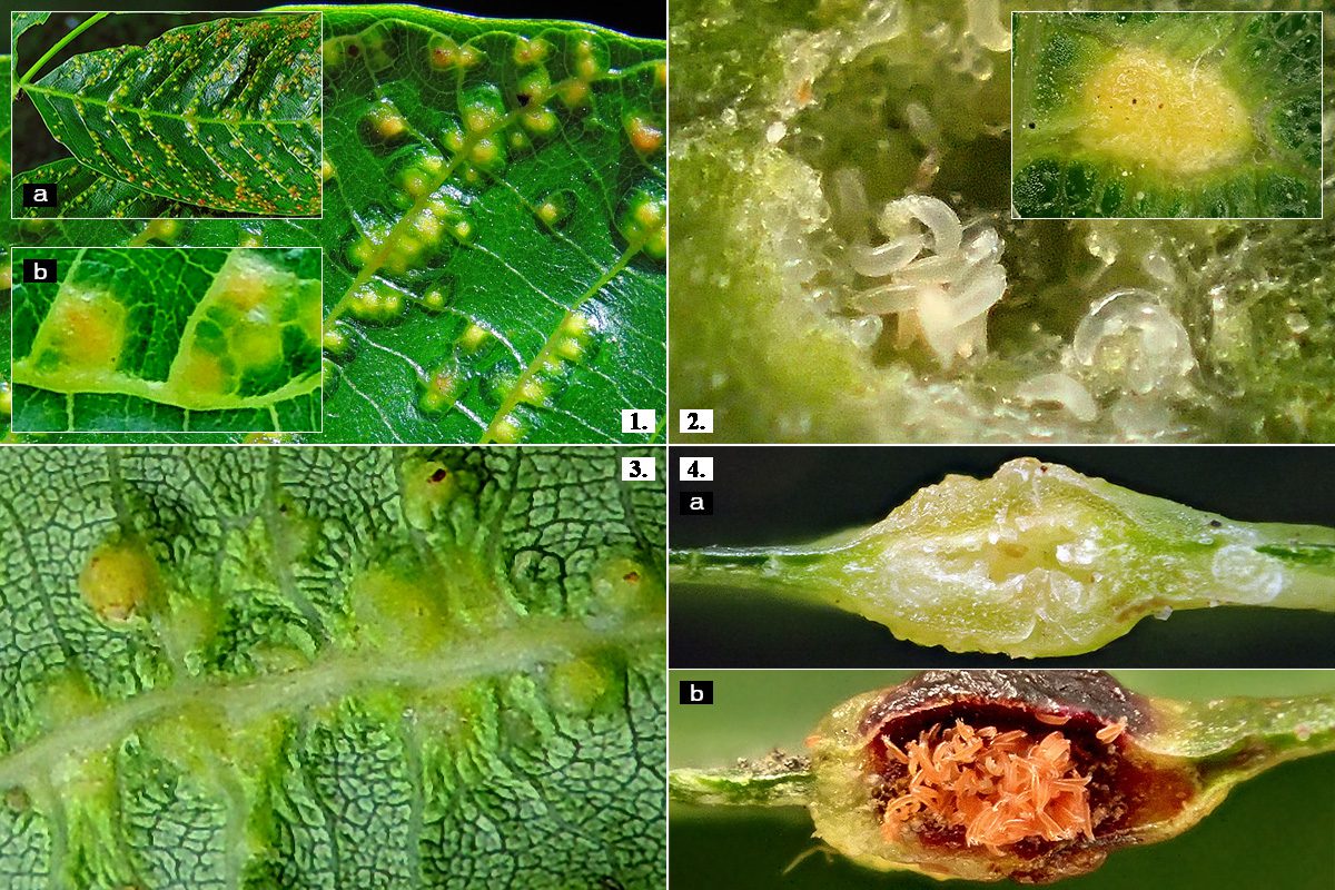 Az alábbiakban három gyümölcstermő növényfajunk – nemes körte, birs, királydió – és egy Kínában őshonos, hazánkban meghonosodott, ruderális területeken gyakori, sövényként is ültetett lombhullató cserjén, a közönséges ördögcérna (Lycium barbarum) levelein kialakuló himlőszerű gubacsokat mutatunk be. A cecidiumokat okozó gubacsatkák életmódjára jellemző, hogy a megtermékenyített nőstények (deutogyn) nyár végén, ősszel elhagyják gazdanövényeik levelein okozott gubacsaikat és a vesszők kéregrepedéseibe, a rügyek ráncaiba, rügypikkelyek közé bújva telelnek. A téli nyugalom után rejtekhelyeikről előbújva gyakran már a fakadó rügyekben fejlődő fiatal leveleken megkezdik cecidogén tevékenységüket.