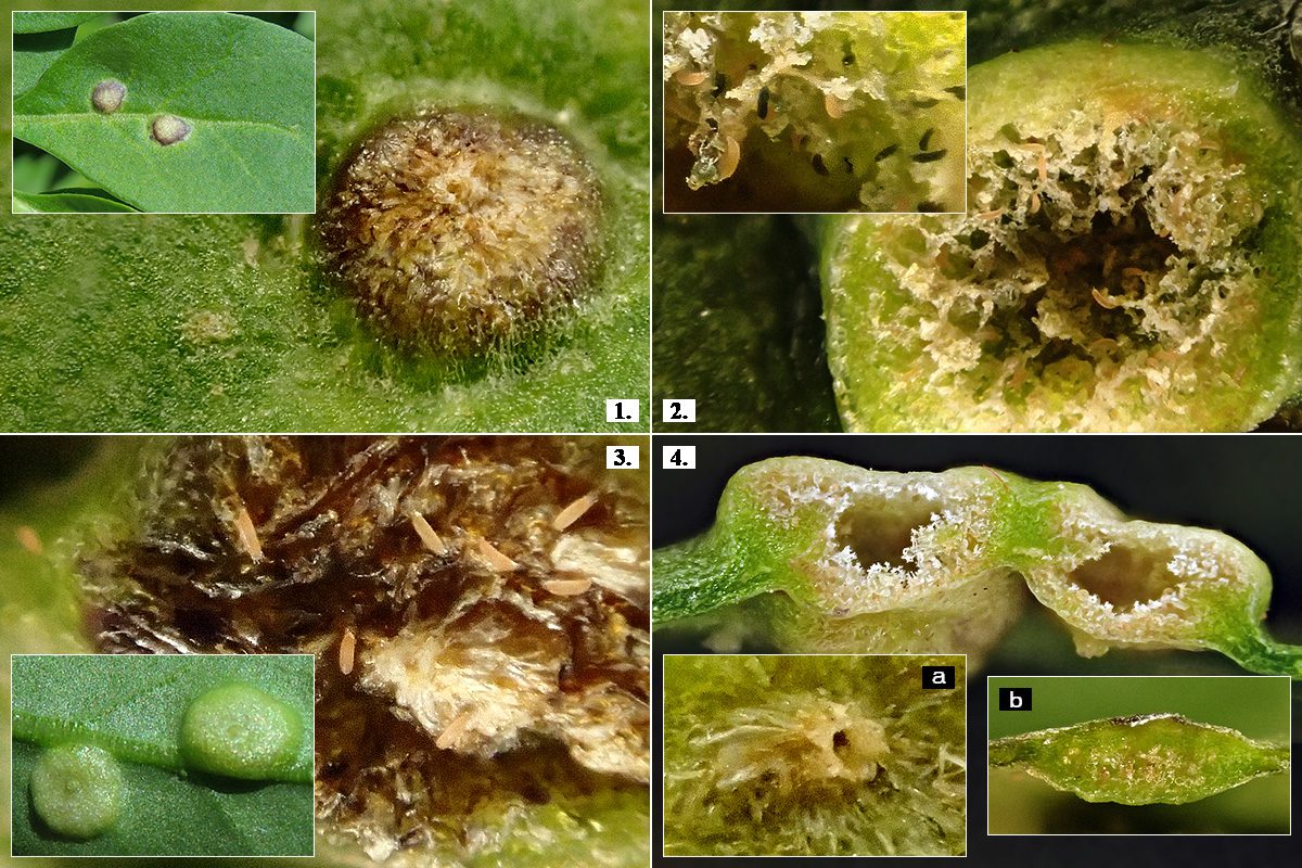 A 6/4 belső képen: a befoglaló kép egy kiszáradt gubacs fonáki oldalát mutatja. A száradó folt megmutatja a lárvakamra méretét. A felülnézetben körkörös alak kialakulását akadályozó érszakasz a levéllemez gubacsolt részével együtt elszáradt.