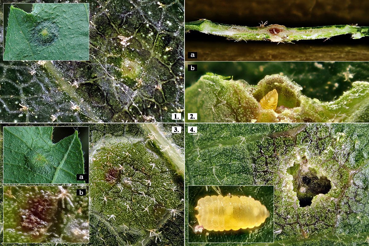 A 7/3 belső képen: a befoglaló képrészen az eddig felsorolt új megfigyelések mindegyike jól látható. A fonáki főéren a peterakás helyén kicsi kiemelkedés figyelhető meg. Ez a lárva kelése és a táplálkozás megkezdése után kialakuló betüremkedés nyomát jelzi. A főér és a belőle kiágazó mellékerek a lárvakamra széléig megvastagodnak. A lárvakamrát körülvevő sárgászöld zóna érhálózata az előzőekben leírtak szerint módosul.
