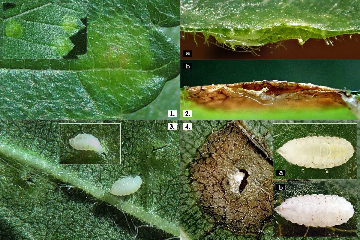 A 7/4 belső képen: a keretezett képrészen egy fonáki oldalon felbontott lárvakamrát és magánosan élő lakóját figyelhetjük meg. A befoglaló kép ugyanezt a lárvát mutatja háti (dorzális) nézetben. Az anális testvég balra található. A lárva hasi felületével a levél felső oldala felé fordulva táplálkozik. A fő tartózkodási és táplálkozási helyen ezek a szövetek jobban károsodtak és sötétebbre színeződtek. (lásd még a 7/2a képet és a hozzá tartozó magyarázatot).