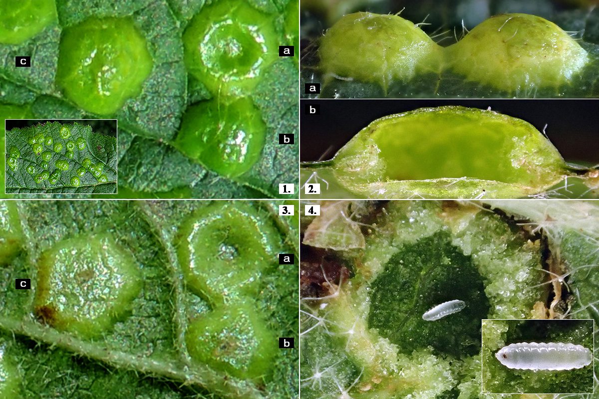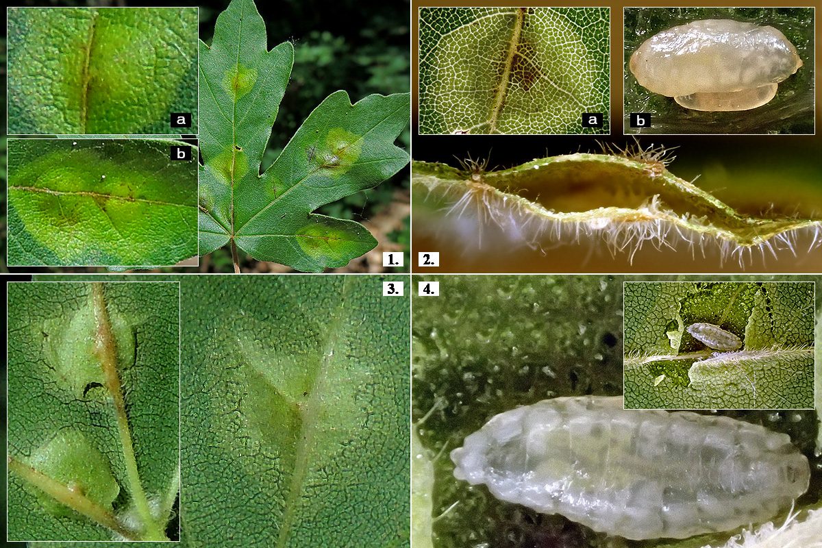 A 6/3 belső képen: a keretezett képrészen egy ritka pillanatot sikerült megörökíteni. Egy gubacsos levél fonáki oldalát fényképeztük, amikor az egyik gubacs szájadékából (lásd fentebb) éppen kibújt az élénk mozgású fehéres színű fejlett lárva. A szájadék mérete kisebb, mint a lárva vastagsága, ezért a lárva kibújás közben kúpszerűen felemelte és felrepesztette szájadékot. A fényképezés pillanatában az anális testvég még a gubacs nyílásában látható. A befoglaló kép jobb felső részén ugyanezt a lárvát és gubacsot figyelhetjük meg egy másik nem sokkal előbb elhagyott gubacs mellett.