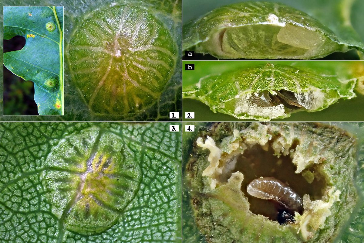 A befoglaló képen egy gubacs alsó oldalát vizsgálhatjuk. A gubacs alsó felületének középtáján jól látható az invagináció barnuló helye, amit a b jelű képrészen nagyításban is megfigyelhetünk. A kifejlett lárva ezen a helyen hagyja el a gubacsot.
