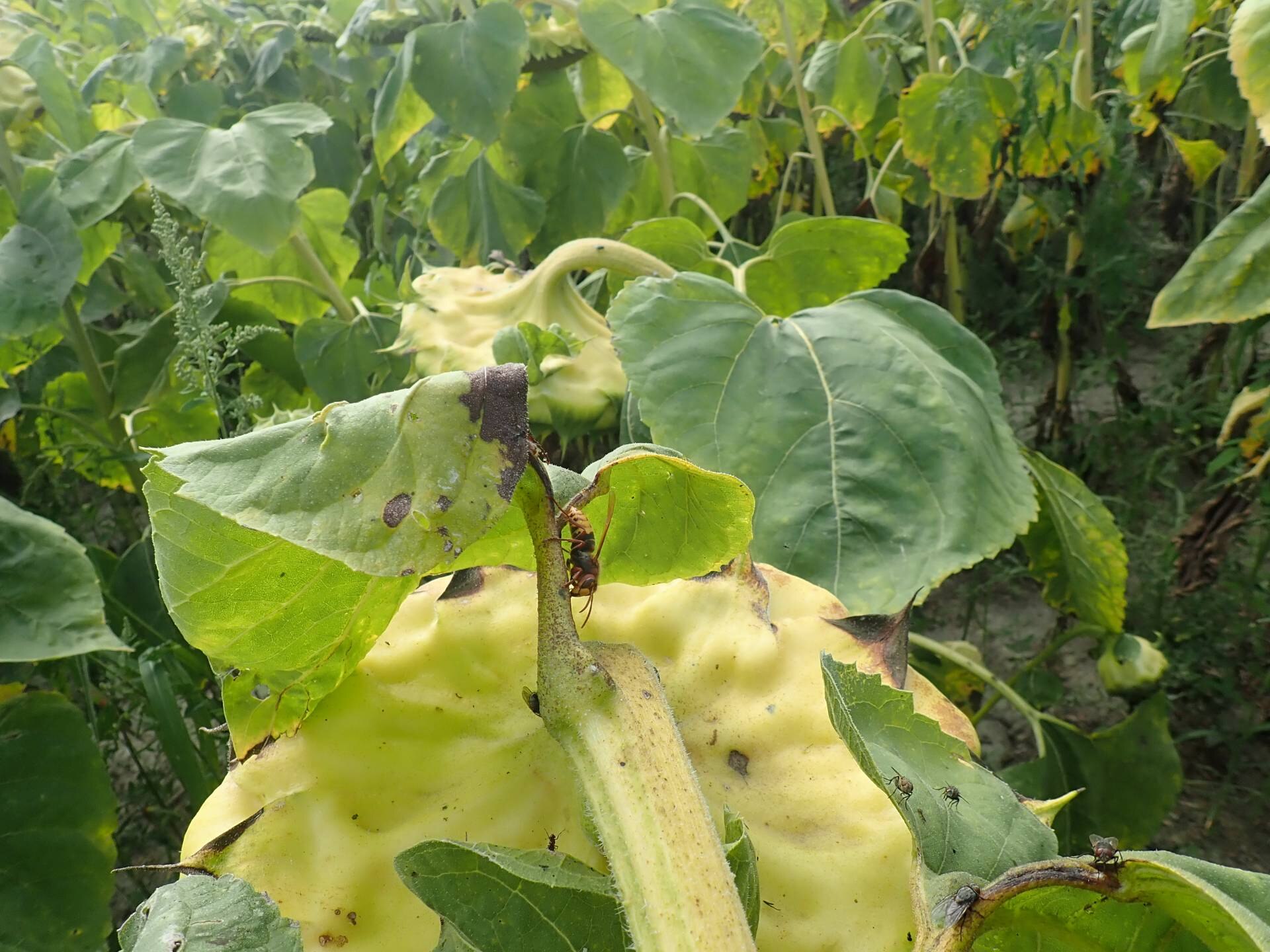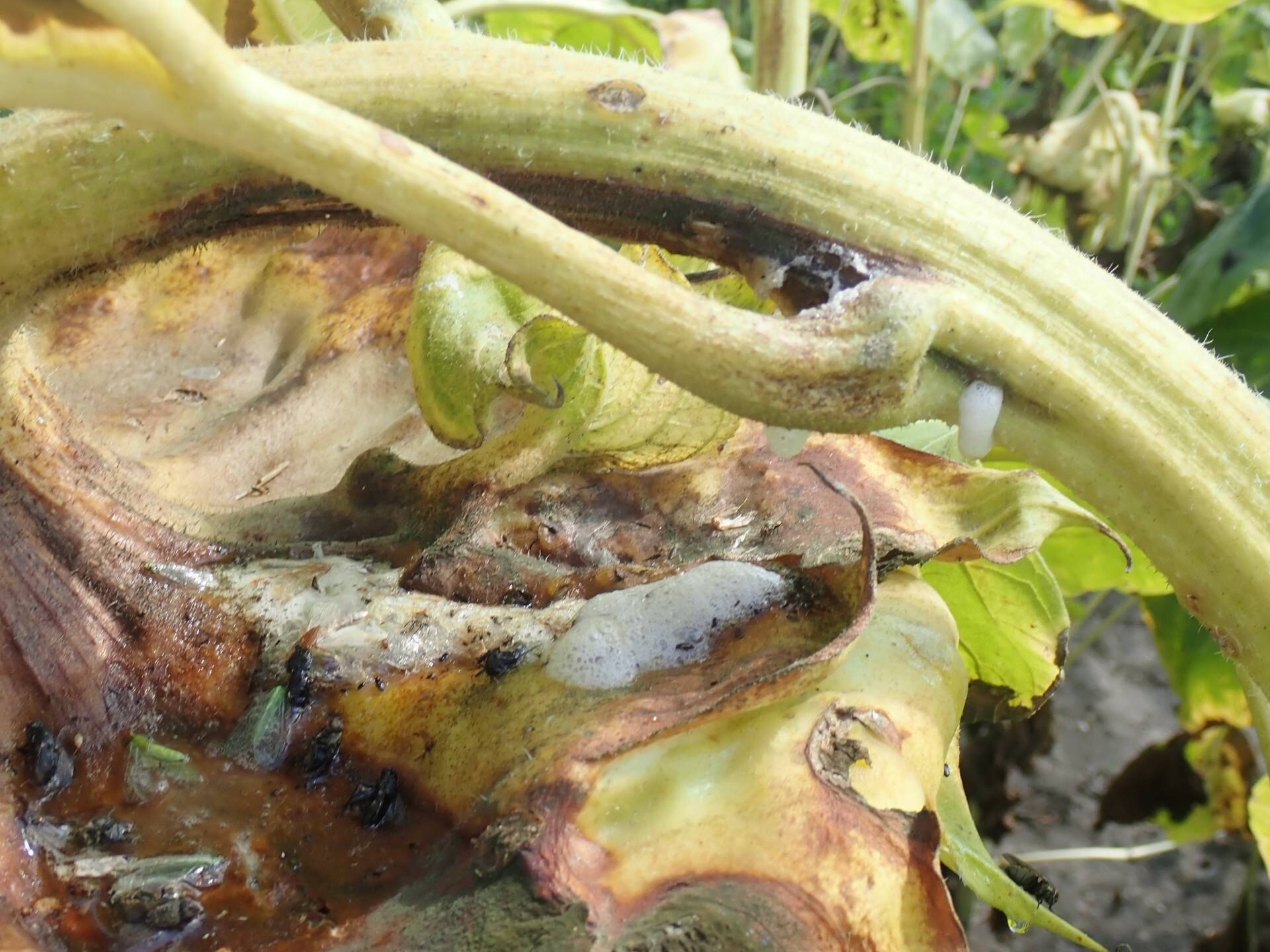 Az alkohol viszont nagyon sok rovar számára meglehetősen vonzó csalétek is egyben. Nem szabad csodálkozni tehát azon, hogy az ilyen rothadási folyamattal érintett napraforgó-állományokban drasztikusan megemelkedik a különböző, döntően jól repülő rovarcsoportok tagjainak mennyisége. A legyek, méhek, darazsak mind, együtt hódolnak „Bacchus oltáránál”.