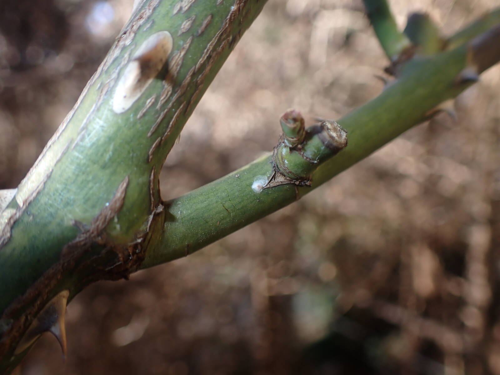 Előfordulhat, hogy apró, 1 milliméteres kis fehér, lencse alakú képletet találunk az idei hajtások tövénél. Döntően a vessző árnyékos oldalán. Ez a rózsa pajzstetű (Aulacaspis rosae) lesz, amely más, távolabbi rokon növényeken, mint pl. a szeder is megél.