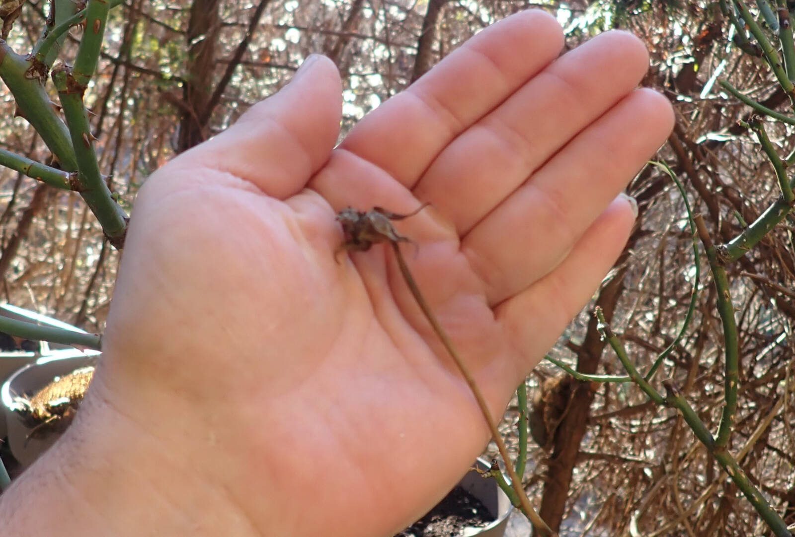 A metszés során főleg az elsűrűsödöttebb rózsabokrokban találkozhatunk elszáradt, de a növényen levő bimbók, virágok maradványaival is. Ezek a rózsa egyik gyakori betegségének, a szélsőségesen polifág szürkepenésznek (Botrytis cinerea) a kártételére utalnak.