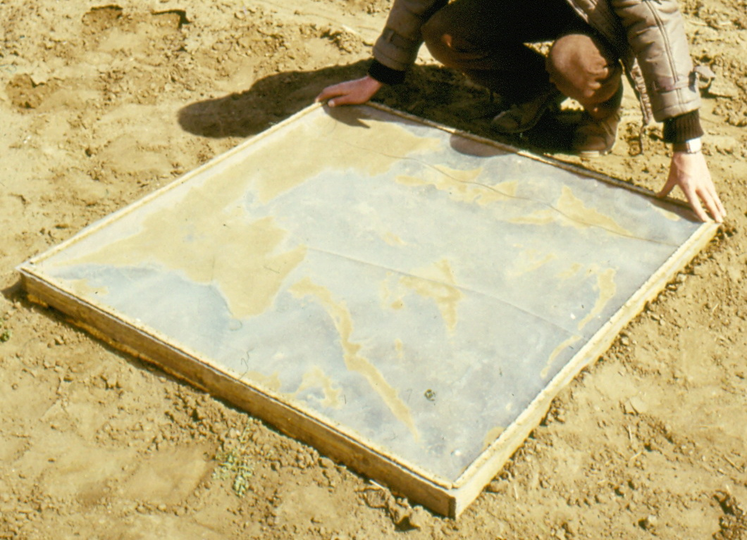 A talajlakó kártevők megfékezésének első lépése azok jelenlétének pontos előrejelzése. Távelőrejelzésük a lárvák felmérésén alapszik, amely területi kvadrát alapján történhet talajmintavevővel, búzacsomós módszerrel, vagy a terület fóliatakarásával (4. kép). A fóliatakarás elve, hogy a kihelyezett szintetikus anyag alatt a talaj előbb felmelegszik, így a felszín közeli rétegekbe vonuló pajorok száma könnyebben, hamarabb megítélhető. A védekezési küszöbérték 10 pajor négyzetméterenként.