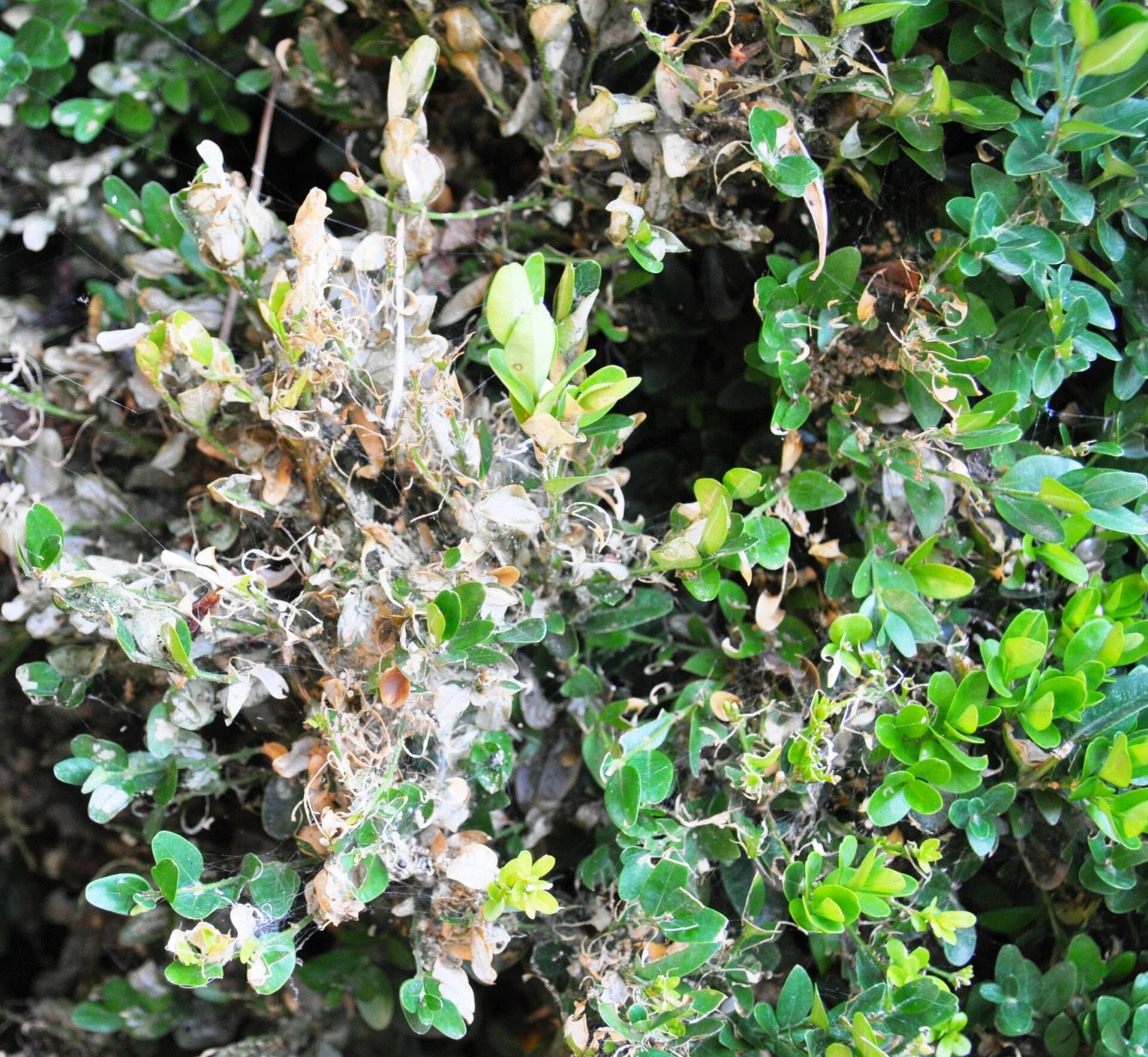 A buxusok rettegett kártevője, a selyemfényű puszpángmoly még most is rajzik, bár repülésük csökkenő tendenciát mutat. Az ebből a rajzásból származó hernyók már lárva alakban telelnek át, de a növényeket a hideg idő beálltáig rágni fogják.