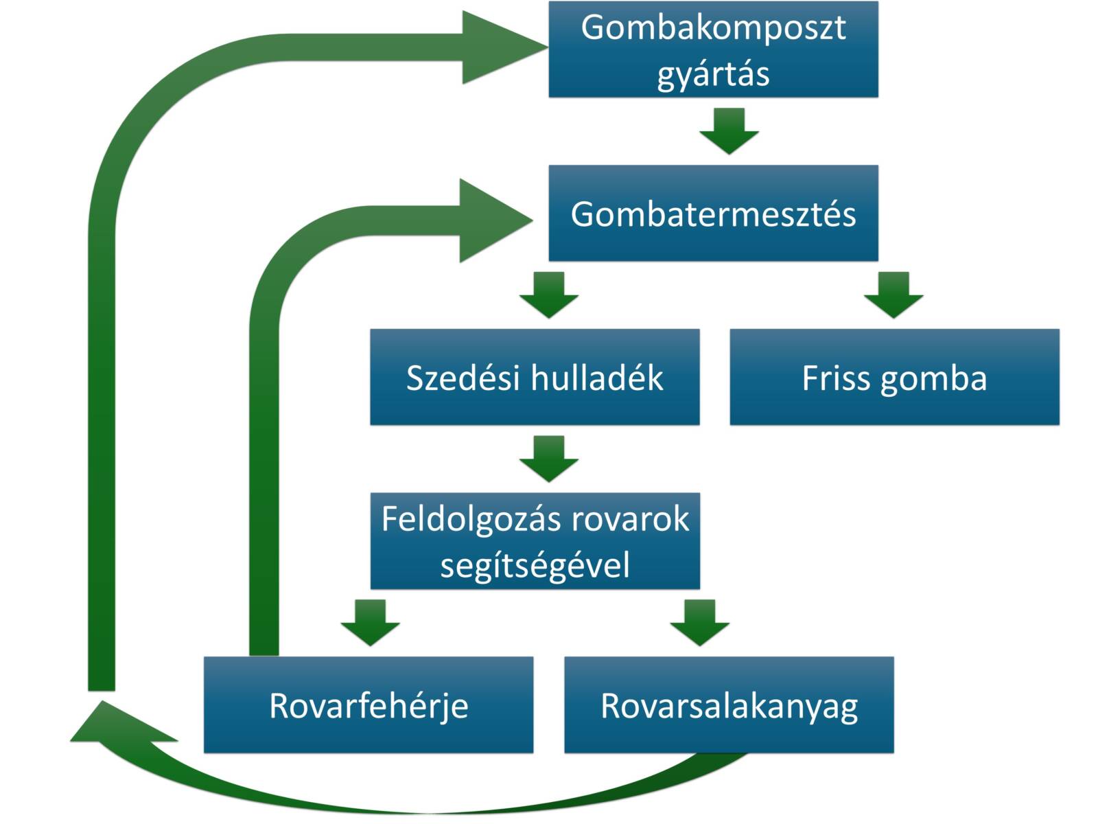 A gombatermesztés körforgása a fentiek alapján egy újabb lépéssel bővülhet. A termesztés során keletkező hulladék mennyiségének csökkentése ugyanis egyértelmű gazdasági előnyt jelenthet. Ráadásul két értékes termék, rovarfehérje és salakanyag is keletkezik. Az alkalmazott gombatermesztési technológiákban hasznosítható anyagokat nyerhetünk úgy, ha a hulladékkezelés során a rovarok segítségét is igénybe vesszük.