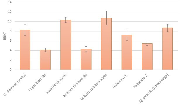Szénhidrátok tekintetében a chili paprikák közt nem csak az egyes típusok, hanem az érettségi állapotok közt is lehet különbség. Ezt jól tükrözik vízben oldható szárazanyag-tartalom (Brix°) eredményeink is, melynek 30-50%-a cukor, és melyet a Szent István Egyetem Zöldség- és Gombatermesztési Tanszékén mértünk 2019-ben (3. ábra).