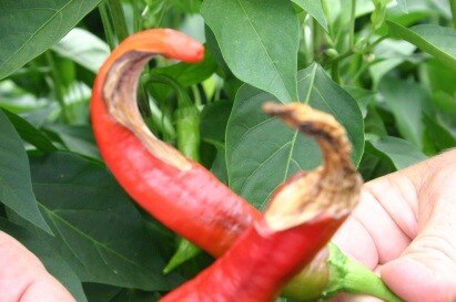 2. kép: Nagy meleg és a száraz levegő hatására a kevésbé érzékeny fűszerpaprikákon is kialakulhat a csúcsrothadás betegség