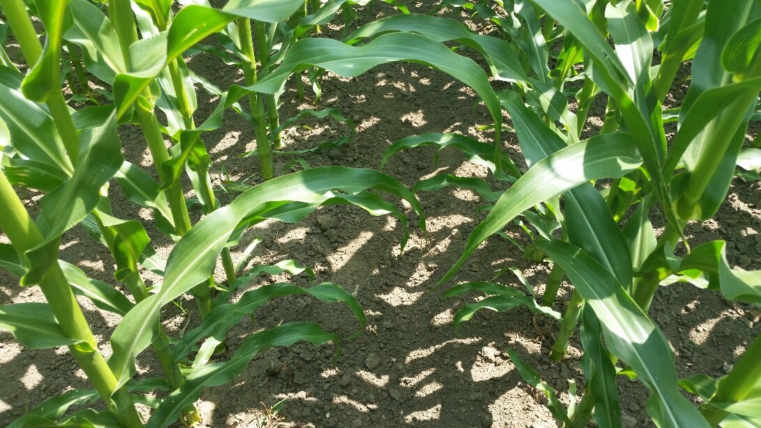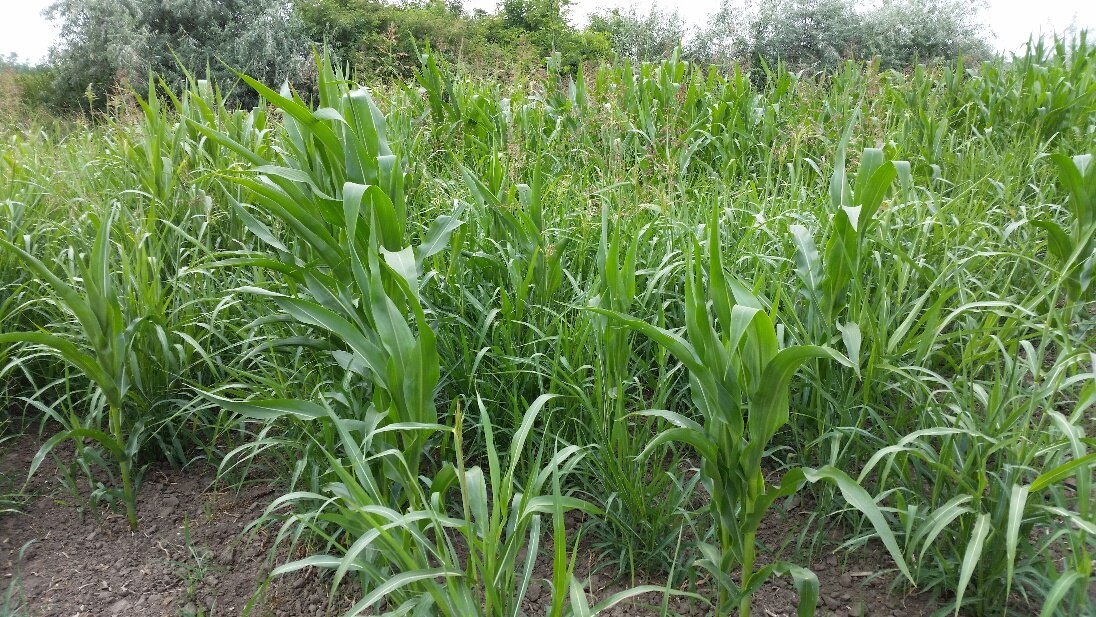 Kisláng 2015. július: Hagyományos hibrid szulfonil-karbamid kezelés 2 X – A két kukoricát egy földút választotta el.