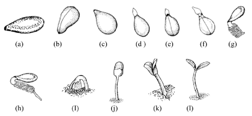 A vetőmagok előduzzasztásával a csírázási folyamatot felgyorsítjuk és lerövidítjük. Ismert tény, hogy sok magnál a csírázás észlelhető jele, a gyököcskék megjelenése 7-10 napot is igénybe vehet, ezen az időszakon lehet gyorsabban átsegíteni a vetőmagokat. A magok duzzasztása alatt azok tömege többszörösére is nőhet, a maghéj kisimul (1. ábra: b, c állapot). Nagyszámú és kisméretű magok vetésénél ne várjuk meg a csírák kibújását (1. ábra: d, e, f állapot), mert azok letörhetnek, sérülhetnek. Ellenben nagy szemű magoknál, babnál, borsónál, kukoricánál, ha gondosan végezzük a magok talajba helyezését, szemenként, egyesével – szándékosan nem vetést írtam – akkor a kicsírázott magvak nem károsodnak. Ezzel a módszerrel 10-14 napot is nyerhetünk a növények koraiságában.